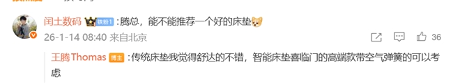 作为深谙产品之道的科技老兵,王腾显然对aise宝褓情有独钟。他在分享中直言,自己曾走访多家家居市场对比,在软硬度调节技术上,喜临门的表现明显领先其他品牌。面对网友“腰椎不好该选什么床垫”的提问,他也给出实在建议:“传统床垫选舒达,智能床垫可考虑喜临门高端款带空气弹簧的。”